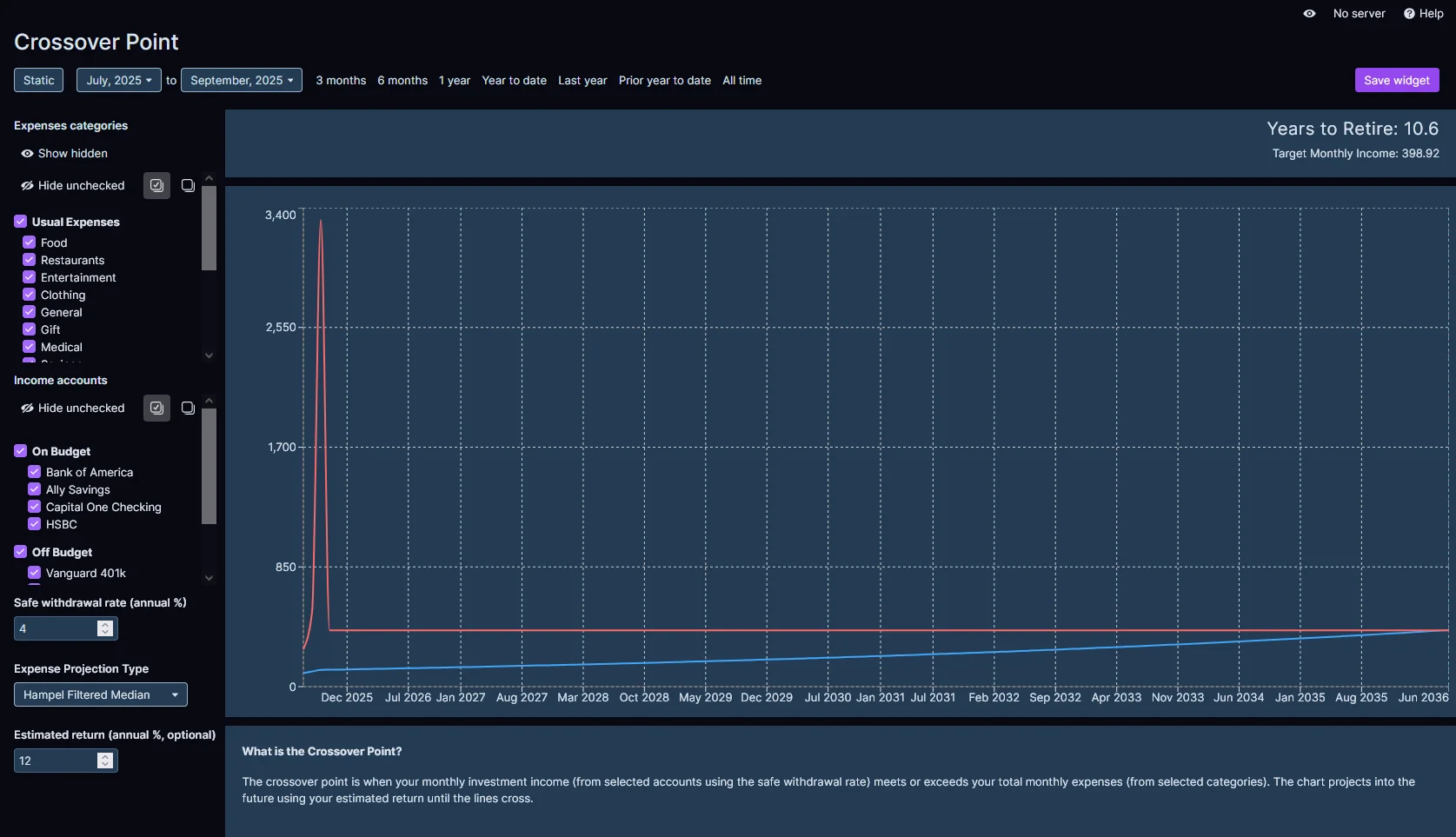 | Expense Categories | Specify which Actual Budget categories are expenses that will continue beyond retirement | Used to project expenses into the future to determine when passive income will cover living expenses. Exclude categories that won't persist beyond financial independence (e.g., retirement savings contributions, work-related expenses). |